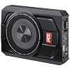 Caractéristiques du MTX RTU8P : Caisson de grave plat clos amplifié, subwoofer : 20 cm (8“), amplificateur bloc mono Classe-AB, puissance Peak : 600 W, puissance RMS : 150 W, filtre actif : variable 50~150Hz, commande EBC incluse, entrées haut et bas niveau, remote automatique sur les entrées haut niveau, sensibilité : 0,1~4V, phase réglable : 0° ou 180°, bass Boost : @45Hz variable 0 à +12dB.